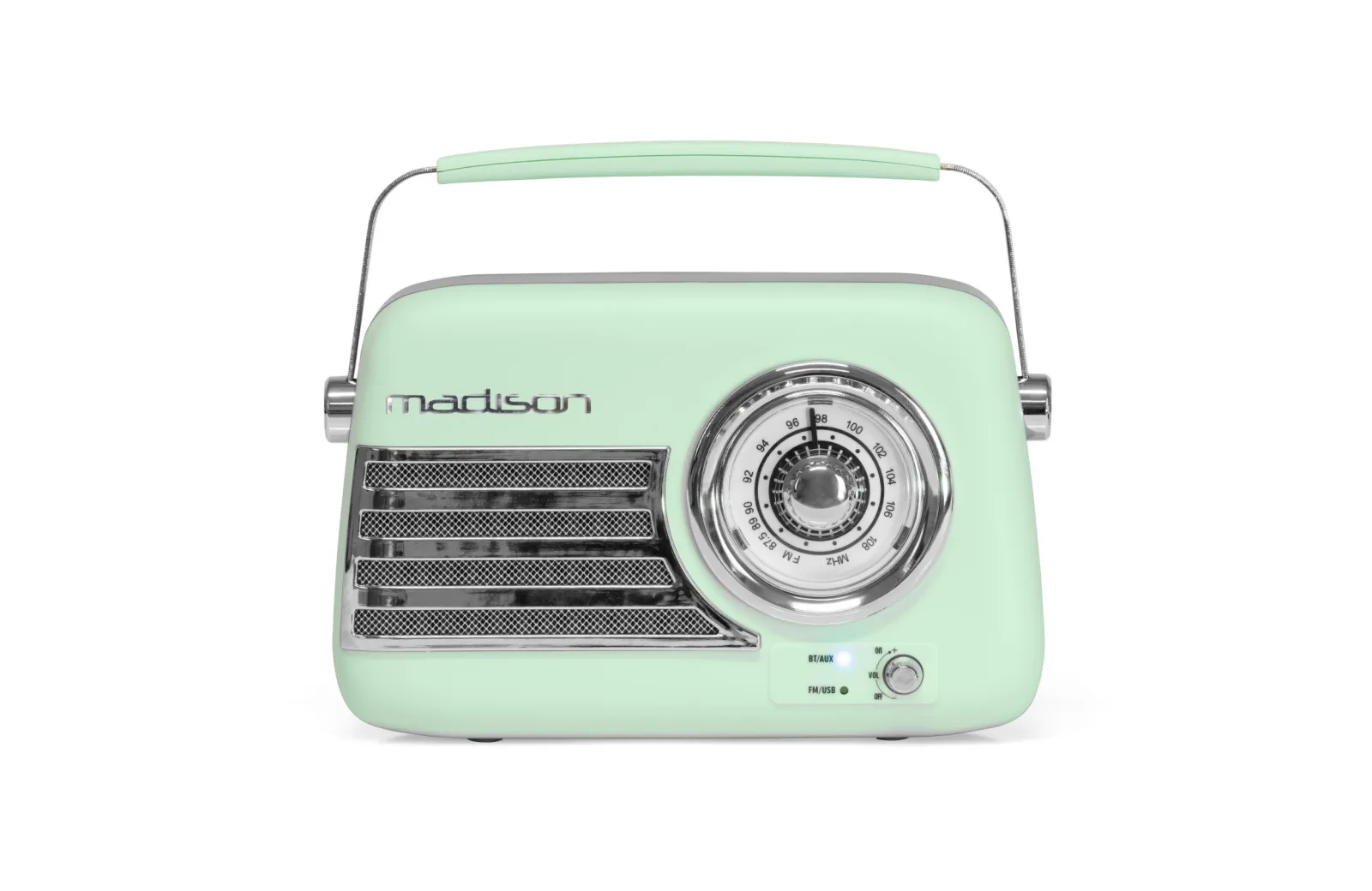 Madison freesound-VR40GR-Mat, φορητό vintage ραδιόφωνο ισχύος 30W με Bluetooth, USB και FM 30. Διαθέτει αναλογική κλίμακα επιλογέα, ενισχυμένα μπάσα καθώς και τηλεσκοπική κεραία οπίσθιας τοποθέτησης. Τεχνικά χαρακτηριστικά:Ισχύς: 30WΣυνδέσεις: Bluetooth, USB, AUX & FMΤάση τροφοδοσίας: 5Vdc 1A 5WΖώνη συχνοτήτων: FM 87.5 - 108MHzΖώνη συχνοτήτων Bluetooth: 2402 - 2480MHzΤύπος μπαταρίας: Λιθίου 3.7Vdc 1500mAh 5.55WhΔιαστάσεις (ΠxΜxΥ): 210 x 80 x 160mmΒάρος: 0.635kg