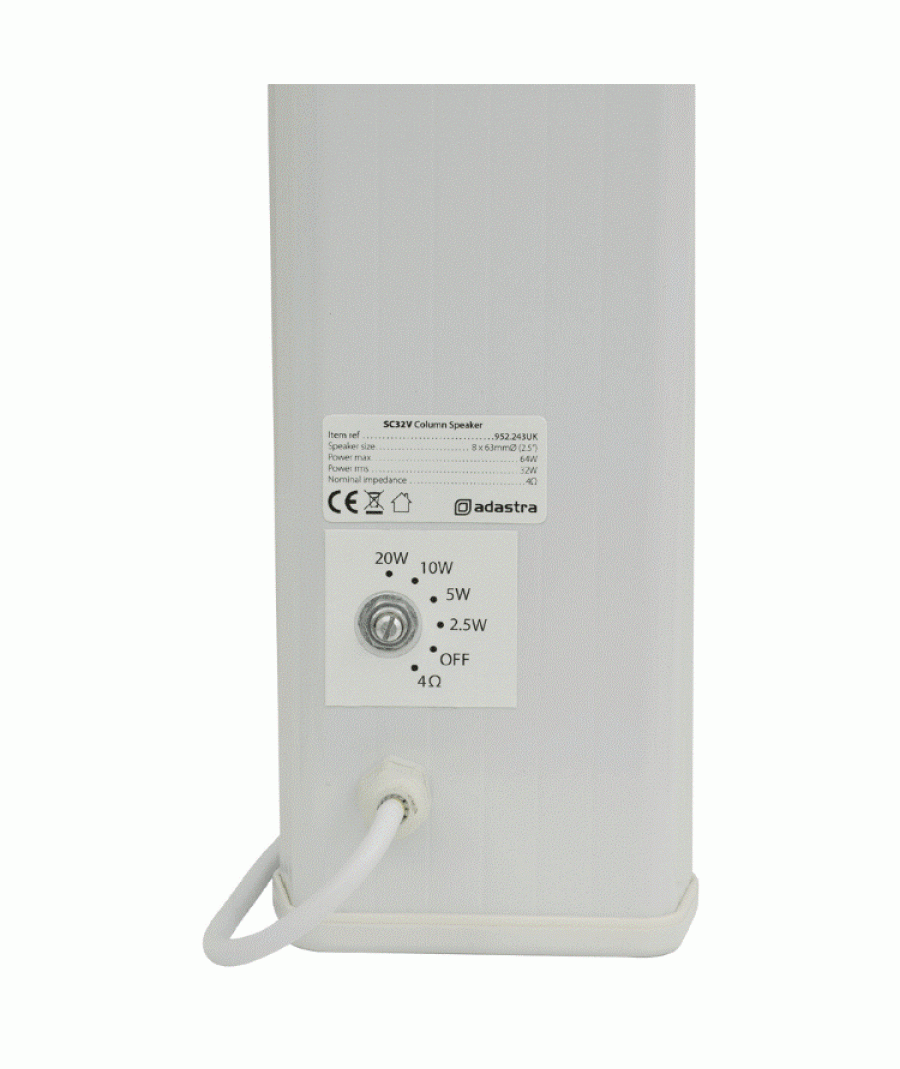 Λεπτή ηχοστήλη, κατάλληλη για εφαρμογές σε εσωτερικούς χώρους, ειδικά όπου η διακριτικότητα αποτελεί αναγκαιότητα. Κατασκευασμένη από αλουμίνιο με λευκό προστατευτικό φινίρισμα, εξοπλισμένη με λευκό μεταλλικό προστατευτικό πλέγμα και λευκά πλαστικά τερματικά καπάκια. Υψηλής ποιότητας ηχείο που παρέχει καθαρή, ευκρινή αναπαραγωγή ήχου και μετασχηματιστή 100V line.