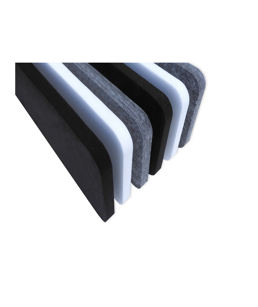 Οι ακουστικοί απορροφητές ECOBAFFLE είναι εξ ολοκλήρου κατασκευασμένοι από πολυεστερική ίνα PET, οι επιφάνειες των οποίων υποβάλλονται σε επεξεργασία με ειδική διαδικασία θερμικής εξομάλυνσης για τη βελτίωση των αισθητικών φινιρισμάτων και της δομικής αντοχής του υλικού.