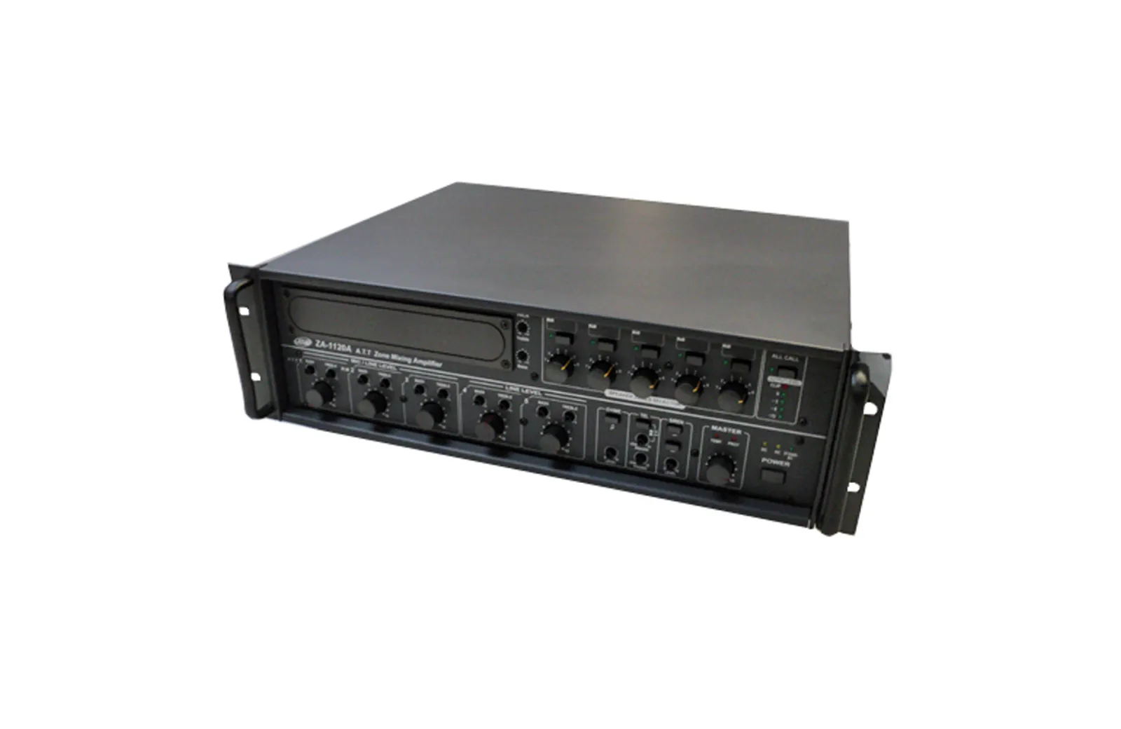JDM ZA1120A επαγγελματικός μίκτης-ενισχυτής 120W/100V πέντε ζωνών με ισχύ 5 x 24W ή 120W στα 4Ω ανά ζώνη. Ολοκληρωμένο σύστημα ελέγχου ήχου, κατάλληλο για μεγάλες εγκαταστάσεις που έχουν πολλούς χώρους όπως εμπορικά κέντρα, ξενοδοχεία ή δημόσια κτήρια.