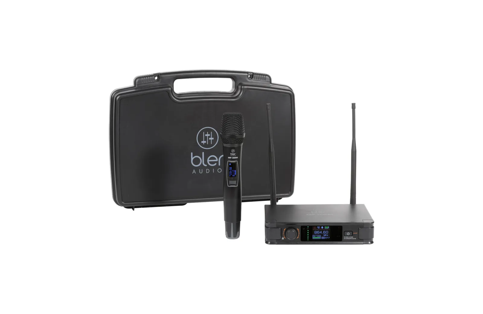 Bler Audio Mono BRP-380HH, σύστημα ασύρματου δυναμικού μικροφώνου υψηλής ποιότητας με αποσπώμενες διπλές κεραίες από τον δέκτη, με μεγάλη οθόνη πολλαπλών ενδείξεων, εμβέλεια 50 μέτρων και δυνατότητα επιλογής 20 συχνοτήτων.