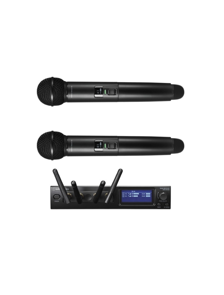 Το ψηφιακό ασύρματο σύστημα System 20 περιλαμβάνει δέκτη 4 καναλιών ATW-R1440 και δύο πομπούς μικροφώνου χειρός ATW-T1402