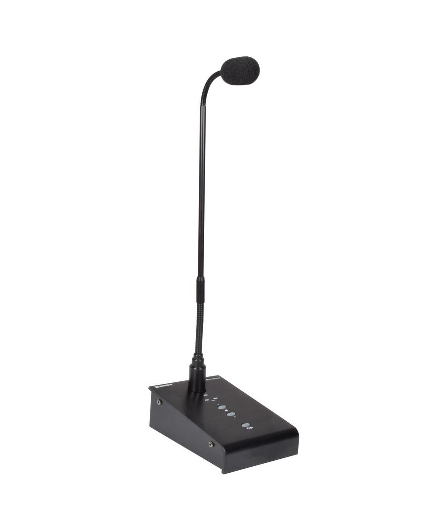 Επιτραπέζιος σταθμός τηλεειδοποίησης με μικρόφωνο με λαιμό σπιράλ τοποθετημένο μέσω XLR σε μονάδα βάσης με ενσωματωμένο διπλό ενισχυτή. Κάθε έξοδος ενισχυτή έχει βιδωτές συνδέσεις ηχείων και μπορεί να τροφοδοτήσει ένα μόνο ηχείο 8 Ohm ή δύο ηχεία 8 Ohm ενσύρματα παράλληλα (4 Ohm ελάχιστο φορτίο κάθε έξοδο) και μπορεί να λειτουργήσει ως στερεοφωνικός ενισχυτής Αριστερό + Δεξί ή ως 2 ξεχωριστές ζώνες. Μια είσοδος AUX σε υποδοχή 3,5 mm μπορεί να δεχτεί μια είσοδο στερεοφωνικής γραμμής για μουσική υπόκρουση με δικό της έλεγχο έντασης και υπάρχει μόνιμα και στα δύο κανάλια. Ένας ξεχωριστός έλεγχος έντασης διέπει το επίπεδο του μικροφώνου και υπάρχει μια προκαθορισμένη παράκαμψη που απενεργοποιεί προσωρινά την είσοδο AUX όταν γίνονται ανακοινώσεις. Η διαδικασία σελιδοποίησης περιλαμβάνει την επιλογή ενός ή και των δύο καναλιών εξόδου μέσω των κουμπιών στον επάνω πίνακα και στη συνέχεια το πάτημα του κουμπιού "Page", το οποίο δίνει τη δυνατότητα σελιδοποίησης μόνο μιας περιοχής ή όλων των περιοχών όπου είναι εγκατεστημένα τα ηχεία. Μια απλή και εύχρηστη λύση όπου ο χώρος είναι περιορισμένος ή απαιτείται ένα απλό σύστημα τηλεειδοποίησης.