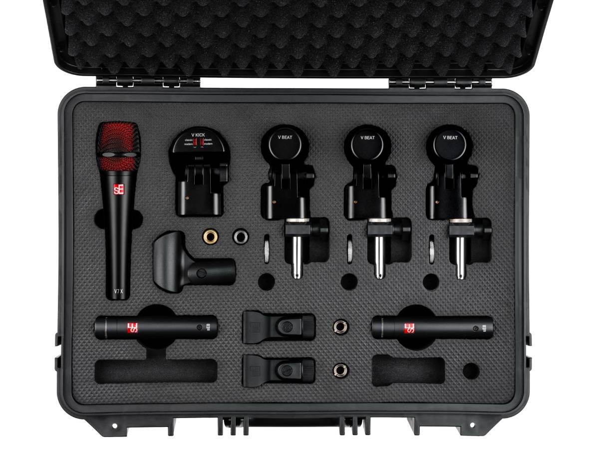 Το V PACK ARENA BLACK αποτελείται από ένα V KICK για τη μπότα, τρία V BEAT και V CLAMPS για τα toms, ένα V7 X για το ταμπούρο, και ένα ζευγάρι sE8 πυκνωτικά μικρόφωνα για τα overheads.