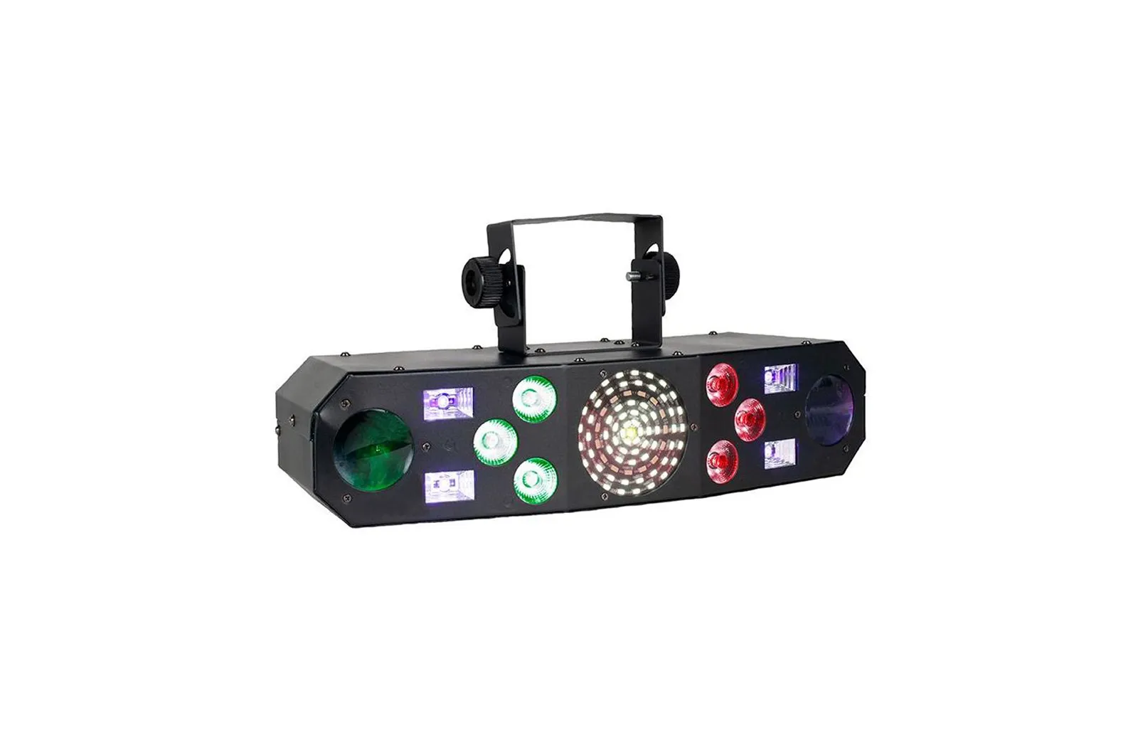 Eliminator Furious Five RG, σύστημα φωτισμού που περιλαμβάνει 5 διαφορετικά εφέ, Strobe, Derby, UV, Wash και laser. Μικρό σε μέγεθος και βολικό στις συχνές μετακινήσεις, μπορεί να χρησιμοποιηθεί σε εκδηλώσεις αλλά και σε μόνιμες εγκαταστάσεις και σε μικρούς χώρους ως μία ολοκληρωμένη λύση