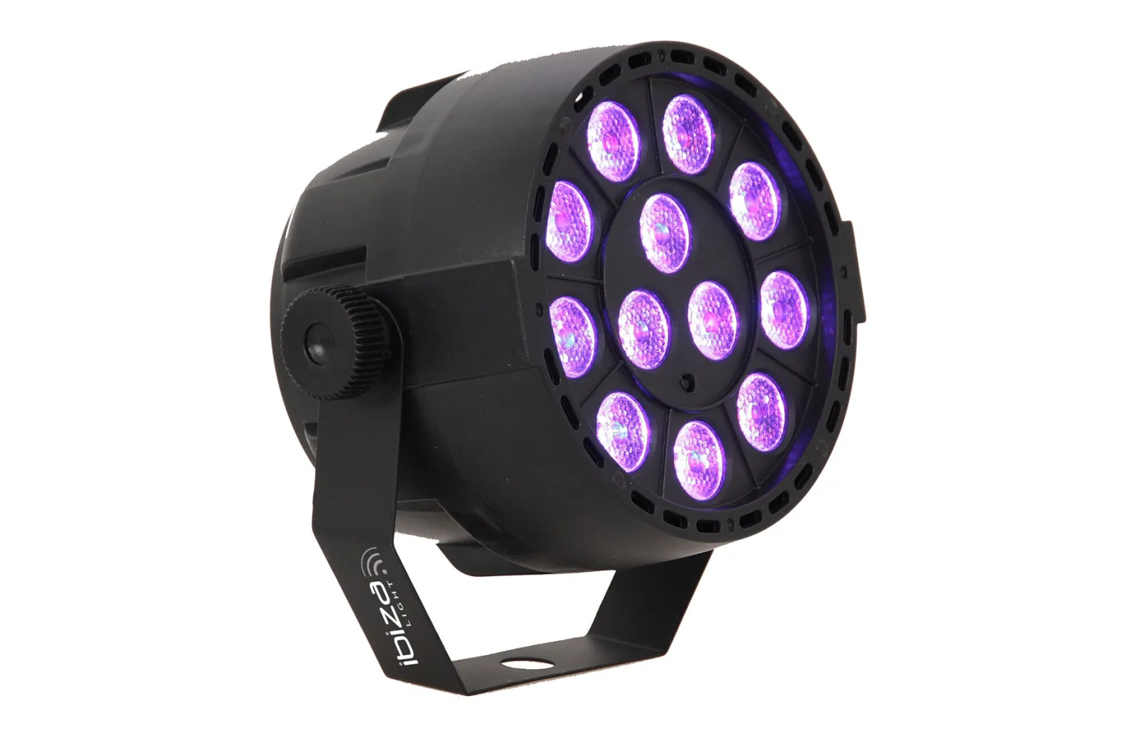 Ibiza PAR-MINI-UV, φωτιστικό UV par με 12 UV LEDs των 2W το καθένα με βραχίονα για εύκολη εγκατάσταση που διαθέτει dimmer και strobe λειτουργία.