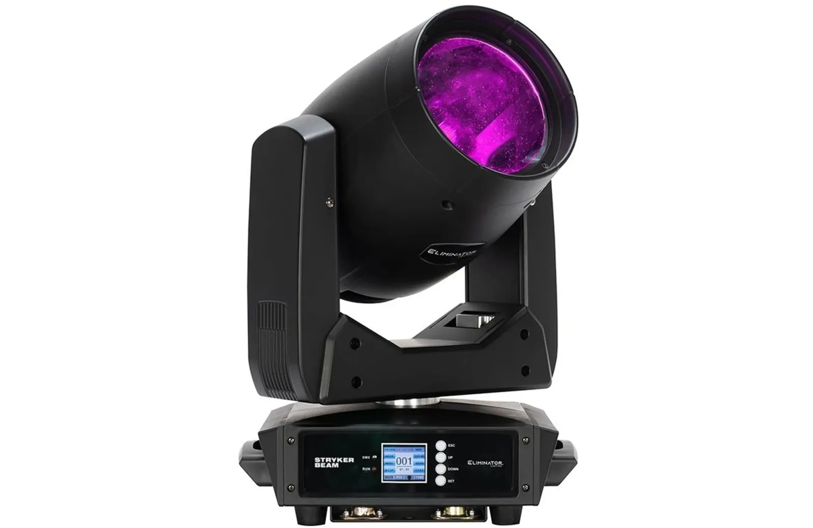 Eliminator Stryker Beam, επαγγελματική κινητή κεφαλή φωτισμού LED 100W, που παράγει συμπαγή δέσμη φωτός με γωνία 6 μοιρών. Σχεδιασμένη για εντυπωσιακό φωτισμό που δημιουργεί διαπεραστικά εναέρια εφέ.