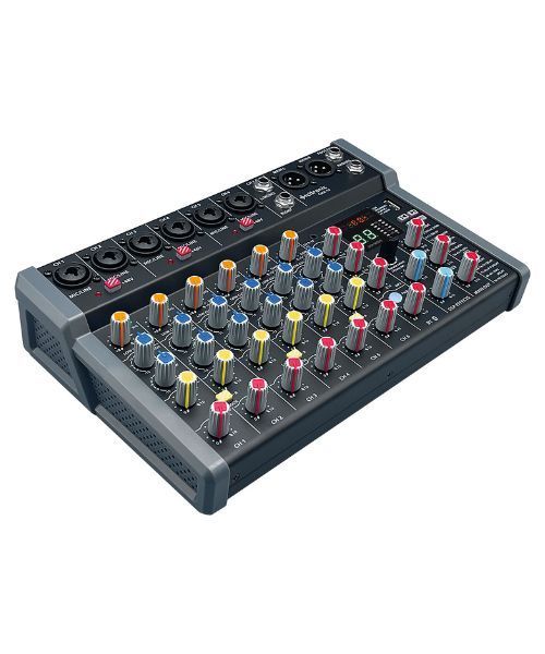 Συμπαγής μίκτης ήχου με 6 μονοφωνικά κανάλια εισόδου, είσοδο στερεοφωνικής γραμμής και επιπλέον είσοδο στερεοφωνικού minijack. Κάθε μονοφωνικό κανάλι mono mic/line διαθέτει είσοδο combo XLR/jack με επιλογή +48V phantom power που ενεργοποιείται ανά ζεύγη για τις εισόδους XLR. Κάθε κανάλι mic/line διαθέτει έλεγχο Gain για την προσαρμογή της πηγής εισόδου και διακόπτη low-cut για την αποκοπή θορύβων ή χειριστικών ήχων από μικρόφωνα. Κάθε μονοφωνικό κανάλι διαθέτει επίσης ελέγχους High/Low EQ και έλεγχο επιπέδου FX. Ζεύγη μονοφωνικών καναλιών μπορούν να συνδεθούν για να λειτουργήσουν ως ζεύγος στερεοφωνικού αριστερού και δεξιού καναλιού αν απαιτείται. Η ενσωματωμένη μονάδα εφέ DSP με ποδο-διακόπτη διαθέτει 99 προεπιλογές για εφέ καθυστέρησης, αντήχησης και τροποποίησης, κάθε μία από τις οποίες μπορεί να ρυθμιστεί χρησιμοποιώντας δύο ελέγχους παραμέτρων. Ο ενσωματωμένος δέκτης Bluetooth διαθέτει κουμπί ζεύξης με φωτισμό και ανεξάρτητο έλεγχο έντασης. Η θύρα USB τύπου Α στην επάνω επιφάνεια είναι για αναπαραγωγή αρχείων ήχου ή μπορεί να χρησιμοποιηθεί για εγγραφή των κύριων εξόδων σε συσκευή αποθήκευσης USB ή ως εξωτερική συσκευή ήχου όταν συνδεθεί σε φορητό υπολογιστή. Η έξοδος παρέχεται σε ζεύγος ισορροπημένων συνδέσεων XLR για χαμηλό θόρυβο και υψηλή ποιότητα για στούντιο ή ζωντανές παραστάσεις.Ενότητα εφέ DSP με 99 ρυθμιζόμενες προεπιλογέςUSB mp3 audio player/recorderΔέκτης Bluetooth με ανεξάρτητο έλεγχο έντασηςΣυσκευή ήχου PC/Mac και εξωτερική τροφοδοσία μέσω σύνδεσης USB ASwitchable +48V phantom powerΜονοφωνικές εισόδους μικροφώνου/γραμμής που μπορούν να συνδυαστούν σε στερεοφωνικόΙσορροπημένες είσοδοι XLR/JackΕίσοδοι στερεοφωνικής γραμμής και στερεοφωνική είσοδος minijackΠαρέχεται σε επενδυμένη τσάντα μεταφοράςΤροφοδοσία USB τύπου CΧαρακτηριστικά:- Weight: 1.395kg